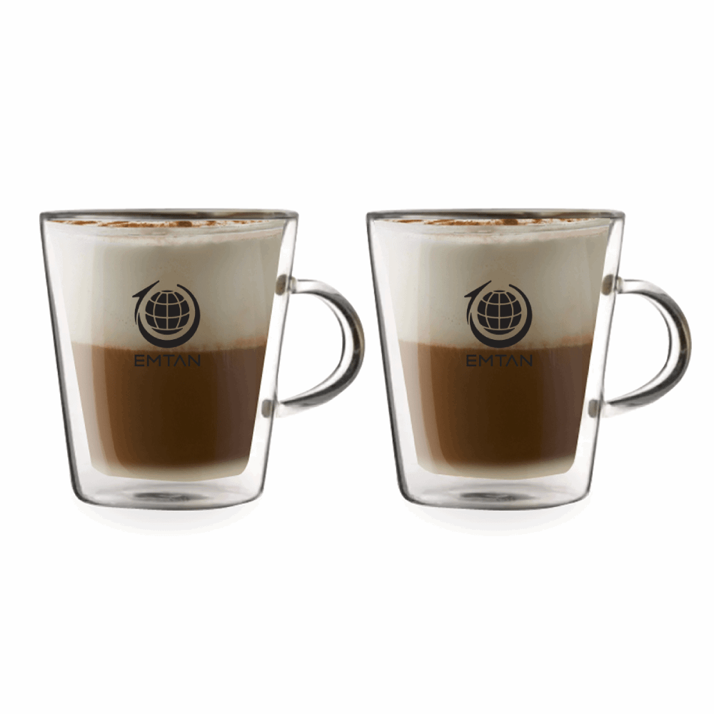 זוג כוסות לשתייה חמה ממותגים עם דופן כפולה וידית אחיזה.