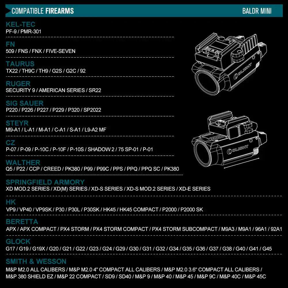 | תכולת החבילה | BALDR Mini (סוללה מובנית) x 1; Picatinny (MIL-STD-1913) מתאם הרכבה למסילה x 1; HM2.5*4.5 בורג כובע שקע x 2; MCC (כבל טעינה מגנטי) מהדורה מיוחדת x 1; H1.5 ברגים אלן x 1; בורג סט נקודת אליפסה x 1; בורג נקודת חרוט x 1; מדריך למשתמש x 1 |